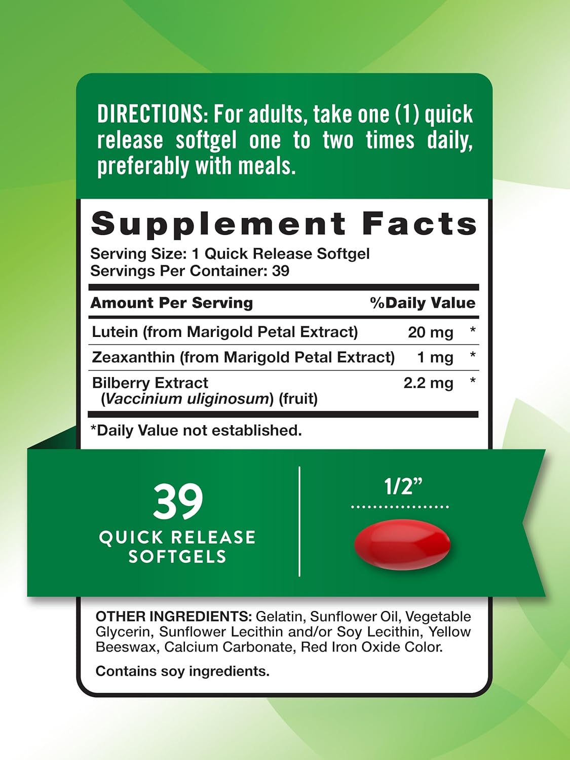 Lutein is a carotenoid, a phytonutrient responsible for the yellow, orange, red, and purple pigments in plants, fruits, and vegetables. Lutein is naturally found in the retina and macula of the eye. Nature?s Truth Lutein quick release softgels has a powerful trio of nutrients to support eye health.? Each serving has 20 mg of Lutein and 1 mg of Zeaxanthin from marigold petal extract, plus 2.2 mg of Bilberry fruit extract for added support. Adults can take one quick release softgel one to two times daily, preferably with meals, to reap the full benefits of this supplement. Our mission at Nature?s Truth is to meet your wellness needs with products that go above and beyond. Nature?s Truth provides supplements in various delivery forms, such as capsules, softgels, chewables, tablets, powders, liquids, and gummies to suit every preference. ?These statements have not been evaluated by the Food and Drug Administration. This product is not intended to diagnose, treat, cure, or prevent any disease.